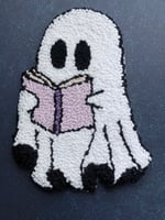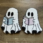 The design features a sweet little ghost reading a book — perfect for book lovers, coffee drinkers, and anyone who enjoys a warm, handmade accent for fall and beyond.