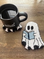 Bookish Ghost Punch Needle Coaster – Cozy Handmade Mug Rug for Readers & Fall Decor