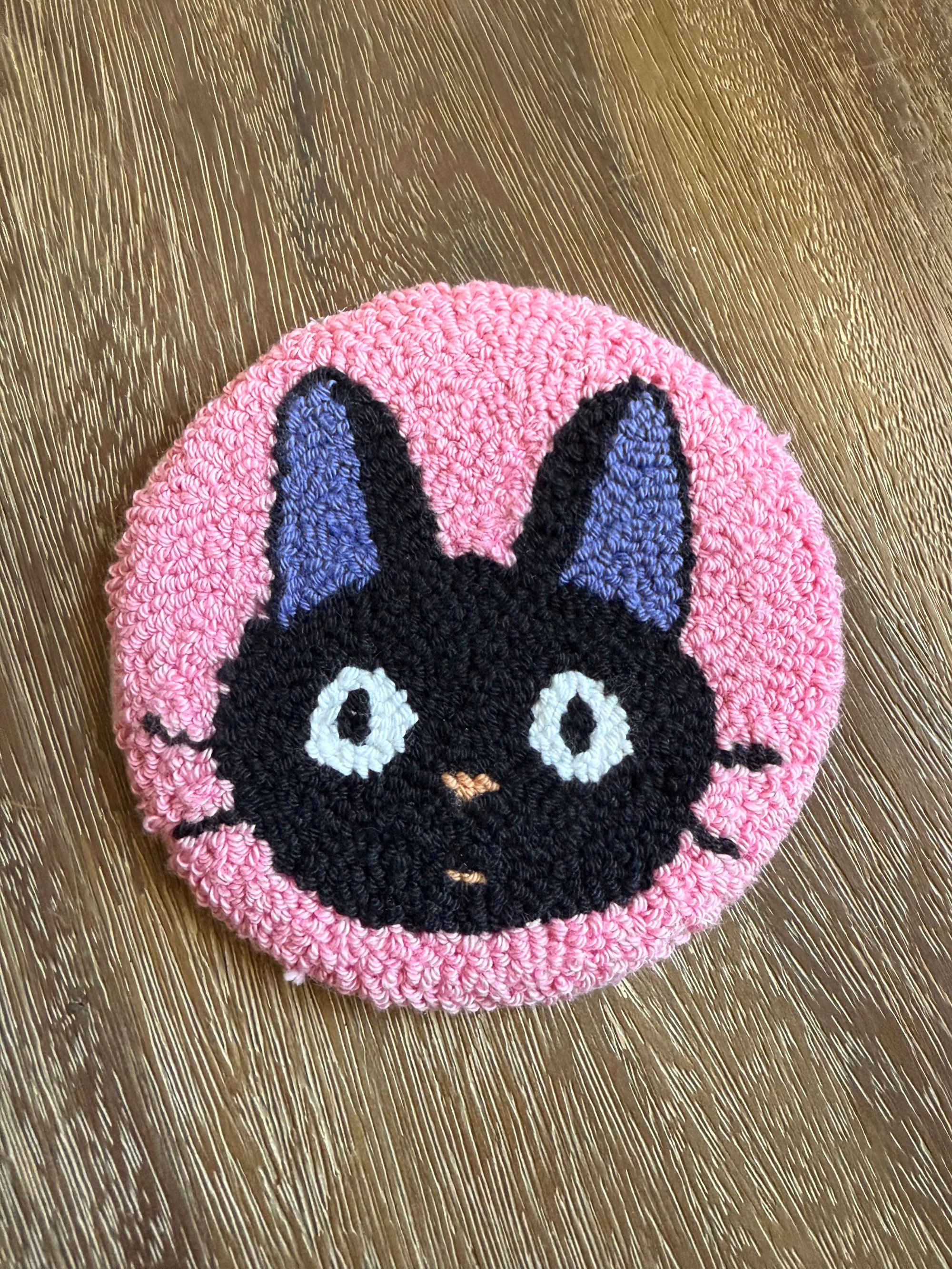 Jiji coaster from Kiki’s Deliver Service. Hand punched needle with 100% cotton yarn with felt backing. Finished size is approximately 5”